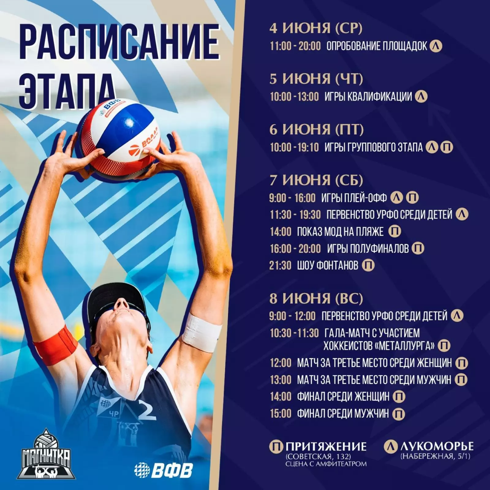 5 июня 2025 года стартуют матчи очередного этапа Чемпионата России по пляжному волейболу. Уже несколько лет подряд Магнитогорск принимает лучших спортсменов со всей страны.Изучаем расписание этапа в Магнитогорске и приходим поддержать волейболистов: в парк отдыха "Лукоморье" и в городской курорт "Притяжение".