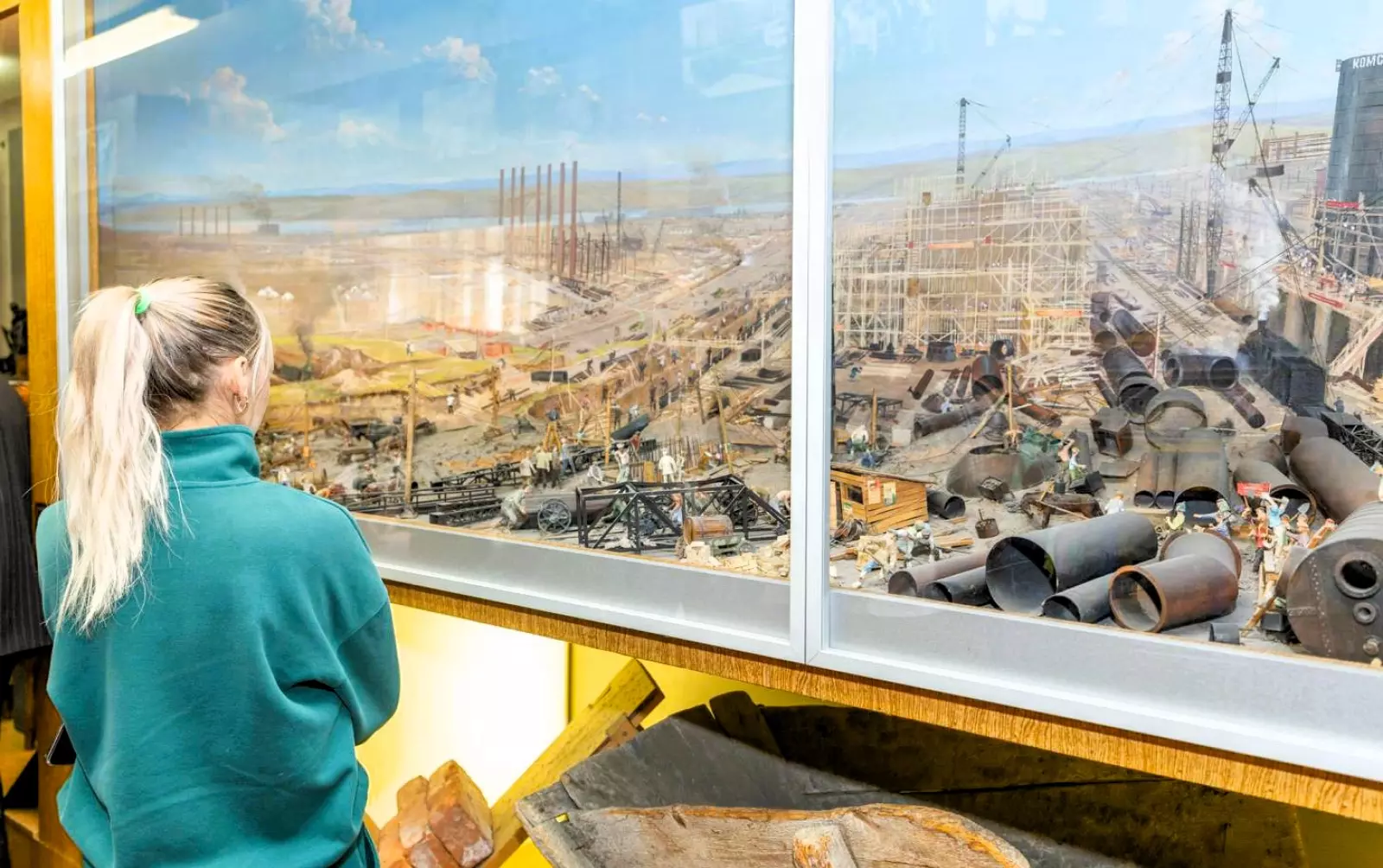 Однако визитной карточкой музея комбината являются диорамы и макеты, изготовленные магнитогорским художником Иваном Надеенко. Так, в музее представлена вся технологическая цепочка металлургического производства в виде действующих макетов производственных агрегатов. Приковывают внимание посетителей также модели горы Магнитной, котлована первой домны и стройплощадки комбината летом 1931 года. Их скрупулезно изготовленные детали (фигурки строителей, каждый из которых занят своим делом, лошадей, машин, зданий и т.п.) можно рассматривать часами. А у макета горы Магнитной принято проверять магнитные свойства лежащего на переднем плане куска железной руды с помощью обычных канцелярских скрепок. А еще завораживает гигантский макет, который полностью воссоздает Магнитогорский металлургический комбинат со всеми его производственными подразделениями и цехами, расположенными не только в городской черте, но и в близлежащих районах.